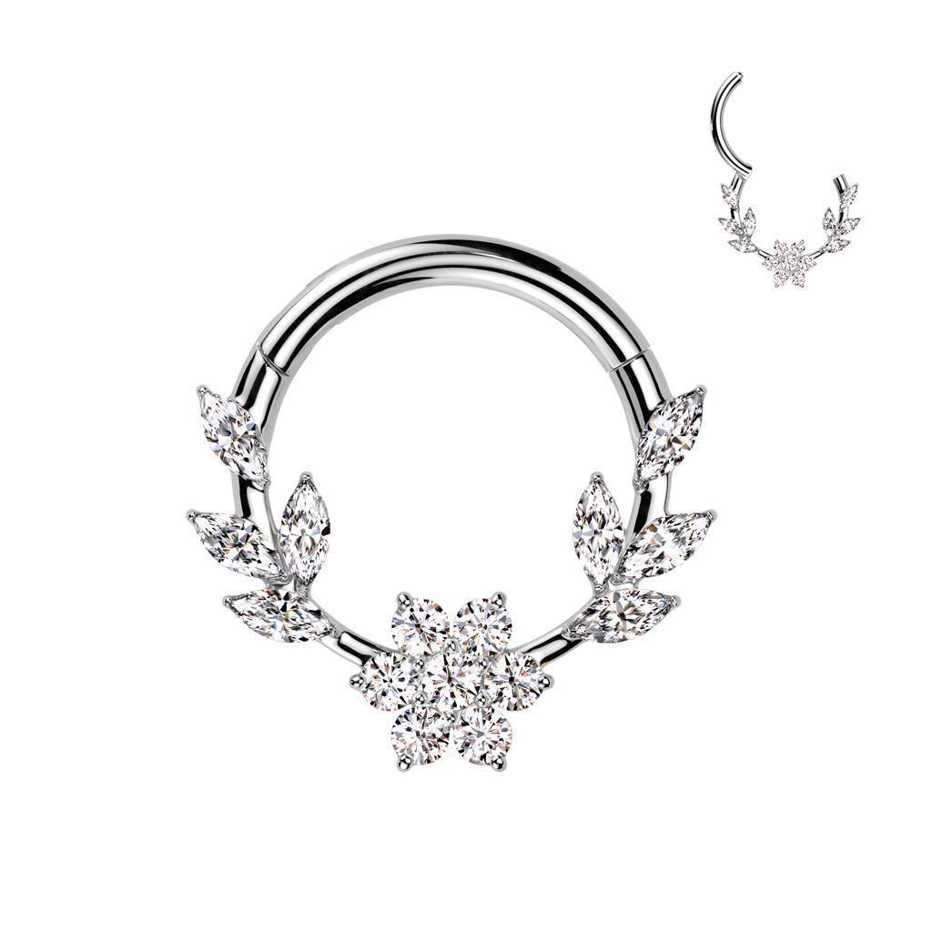 Piercing kruh segment zdobený kytičkou s lístky s čirými zirkony. Piercing má praktický rozevírací pantík.