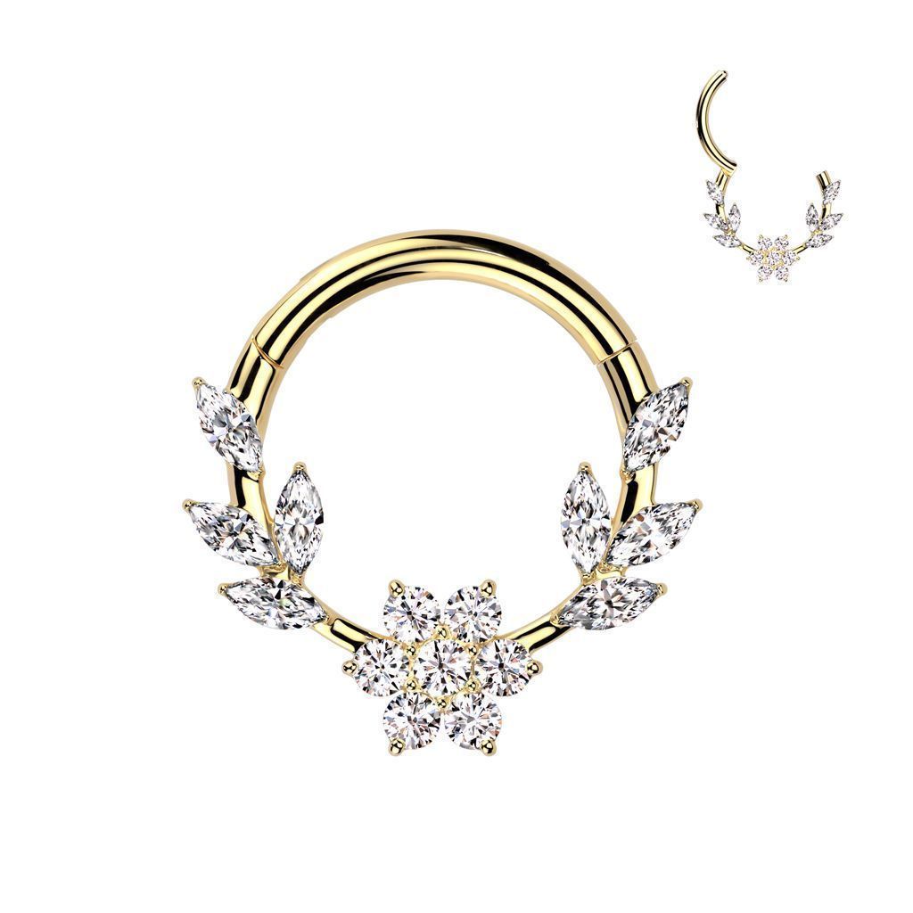 Piercing kruh segment zdobený kytičkou s lístky s čirými zirkony. Piercing má praktický rozevírací pantík.