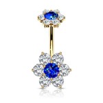 Piercingový šperk určený pro piercing pupíku. Povrchově zlacený v barvě žlutého zlata. S kytičkami zdobenými čirými zirkony a tmavě modrým středem.