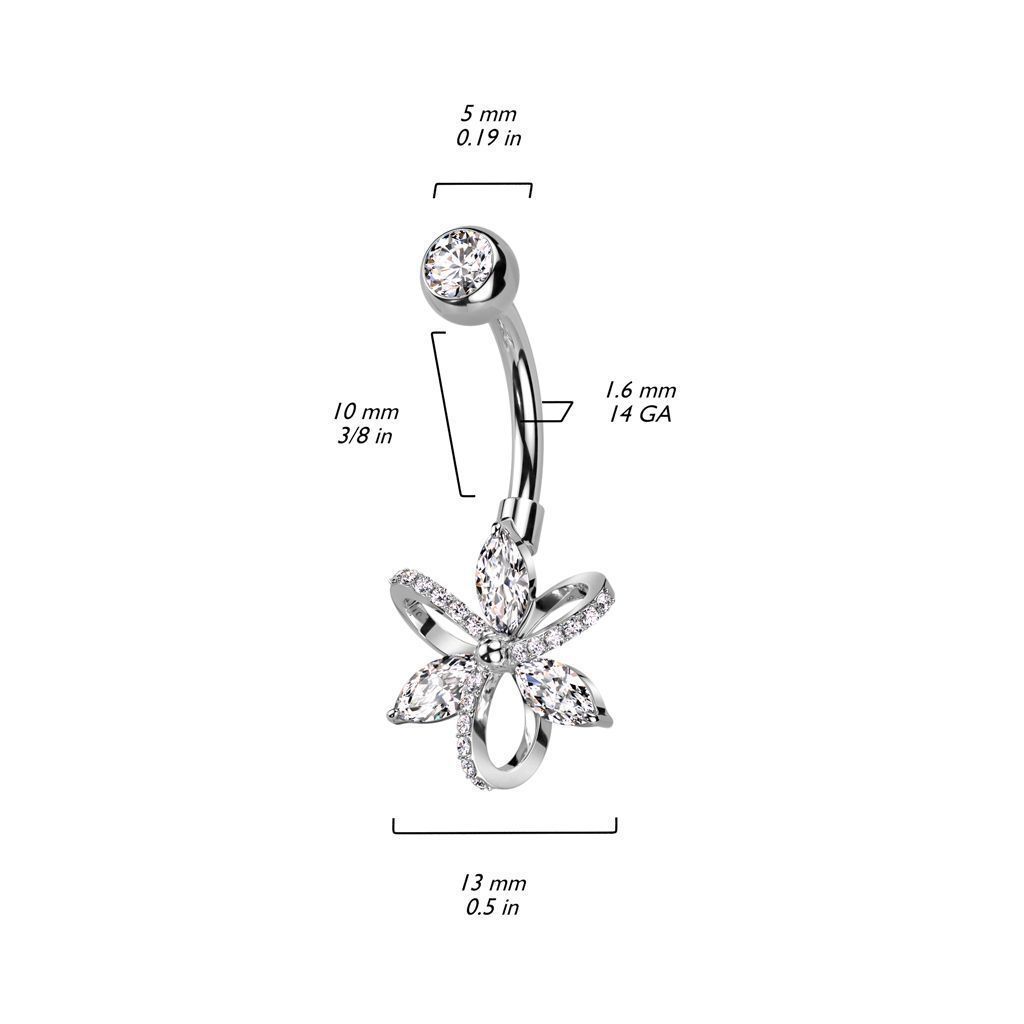 Piercing banánek do pupíku s ozdobou kytičky. Květ je bohatě zdoben čirými zirkony.