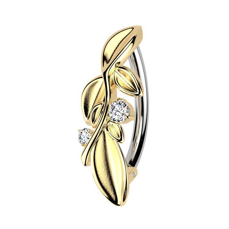 Piercingový šperk určený pro piercing pupíku. S ozdobou lístečků. Lístky jsou zdobeny čirými zirkony.