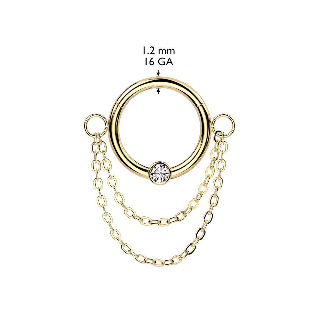 Piercing kruh zdobený zirkonem a ozdobnými řetízky. Piercing lze použít do ucha jako helix nebo do nosu jako septum.