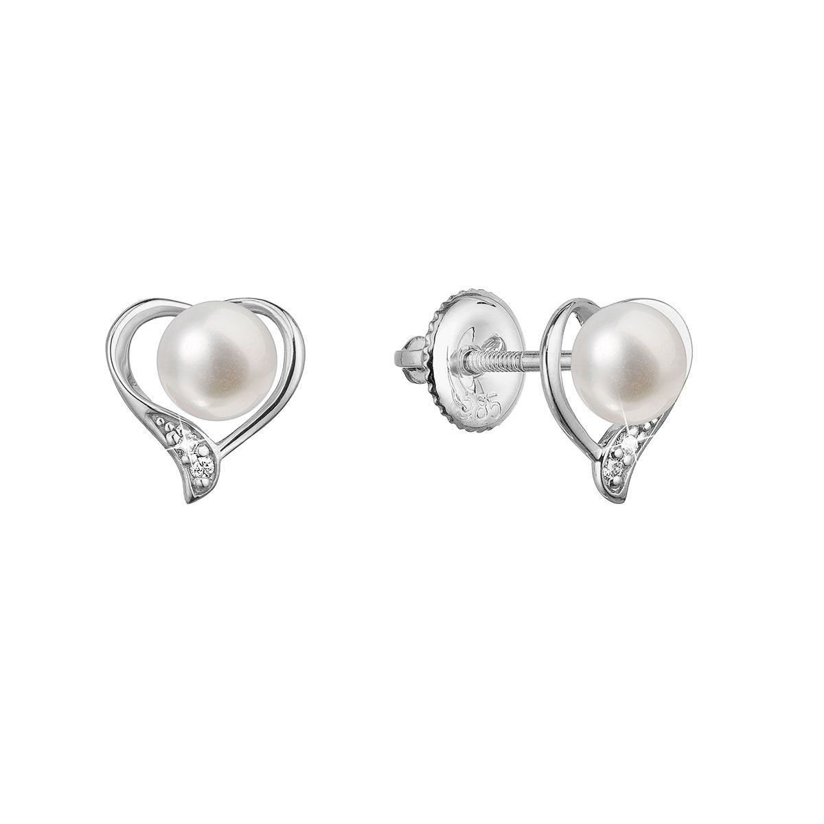 Zlaté 14 karátové náušnice srdce bílé zlato s říční perlou a brilianty 81PB00054