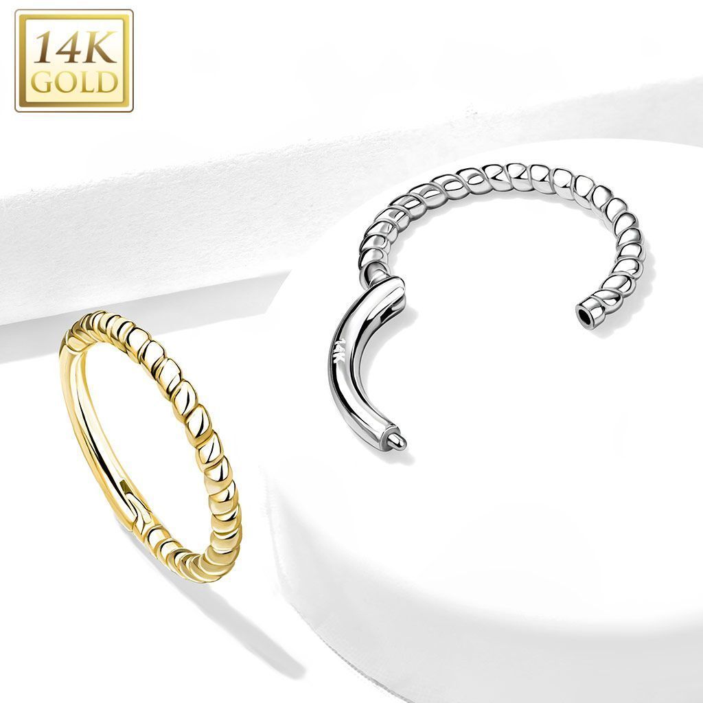 Zlatý piercing kroužek vhodný do nosu nostril nebo do ucha - 14kt žluté zlato. Piercing je zdobený kroucením.