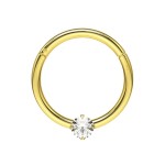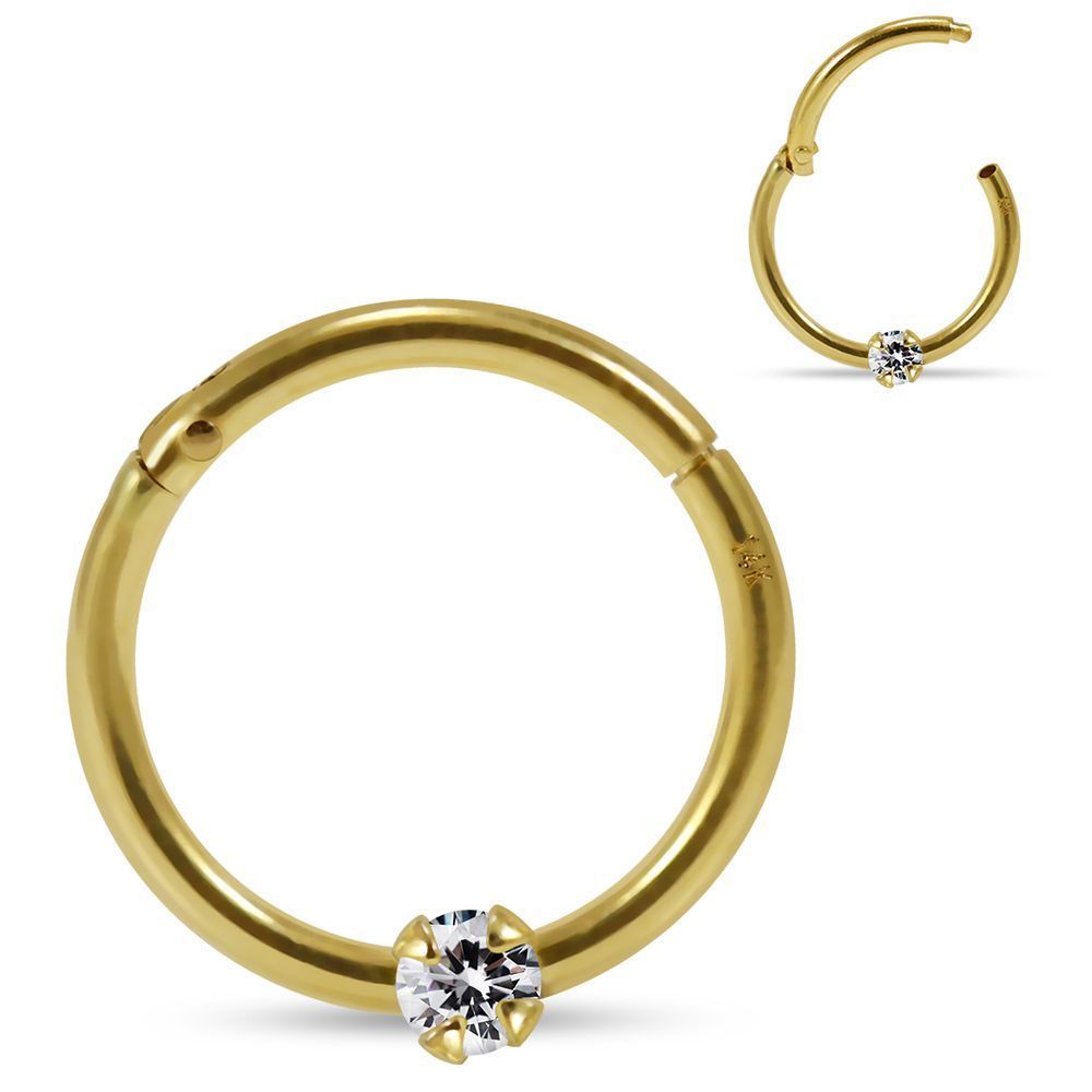 Luxusní zlatý piercing - segment kruh s praktickým otevíracím pantíkem pro pohodlné otevírání a zavírání. Piercing vhodný pro septum nebo pro piercing ucha. Piercing zdobený 2 mm čirým zirkonem.